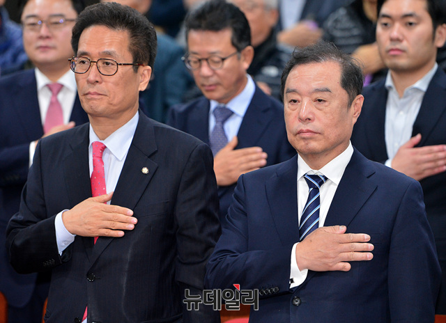[포토] 국민의례 하는 김병준-함진규