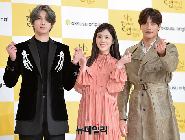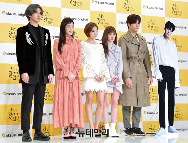 웹드라마 '나는 길에서 연예인을 주웠다'의 배우들(성훈, 김가은, 박수아, 지호성, 미미)이 1일 오후 서울 영등포구 타임스퀘어에서 열린 제작발표회에 참석해 포즈를 취하고 있다.