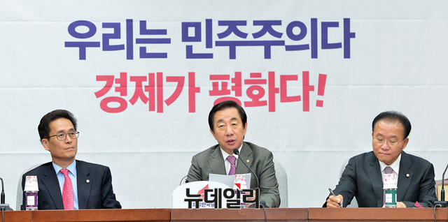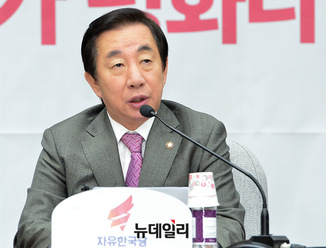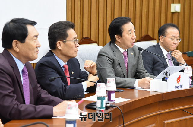 김성태 자유한국당 원내대표가 2일 오전 국회에서 열린 원내대책회의에 참석해 모두발언 하고 있다.