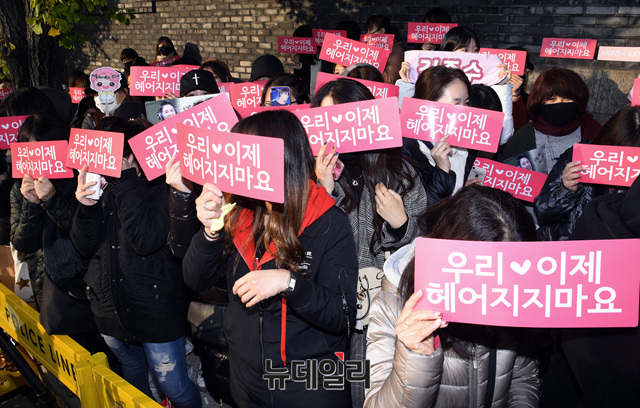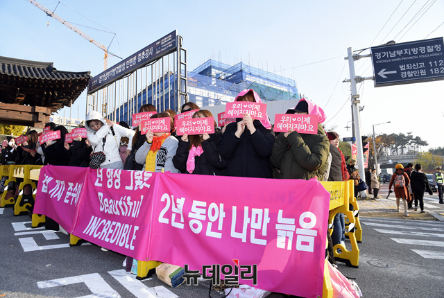 그룹 제이와이제이(JYJ : 재중, 유천, 준수) 팬들이 5일 오전 경기 수원시 장안구 경기남부지방경찰청에서 열린 전역 행사에 참석해 김준수를 기다리고 있다.