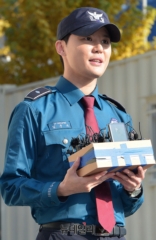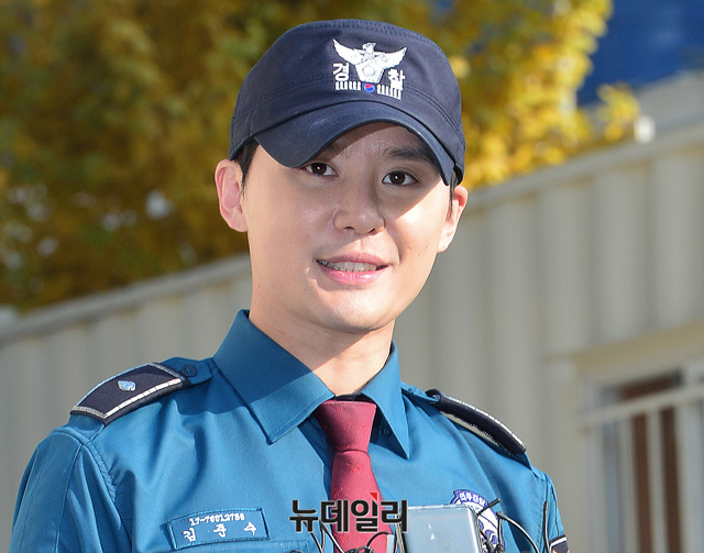 그룹 제이와이제이(JYJ : 재중, 유천, 준수) 김준수가 5일 오전 경기 수원시 장안구 경기남부지방경찰청에서 열린 전역 행사에 참석해 질문에 답하고 있다.