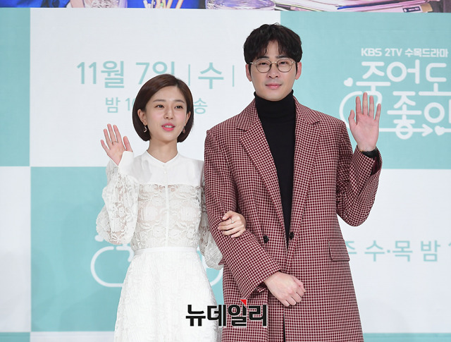 배우 강지환, 백진희가 5일 오후 서울 영등포구 타임스퀘어 아모리스홀에서 열린 KBS 2TV 수목드라마 '죽어도 좋아(극본 임서라, 연출 이은진 최윤석)' 제작보고회에서 포토타임을 갖고 있다.