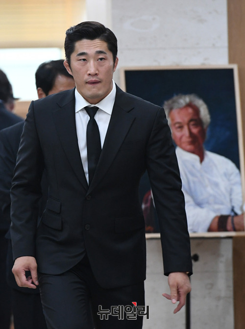 이종격투기 선수 김동현이 5일 오후 서울 송파구 풍납동 서울아산병원 장례식장에 마련된 故 신성일(81) 의 빈소에서 조문을 마치고 빈소를 나서고 있다. (사진=공동취재단)