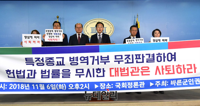바른(軍)인권연구소와 이종명 자유한국당 의원이 6일 오후 국회 정론관에서 '양심적' 병역거부 판결 및 대체복무제 관련 기자화견을 갖고 있다.