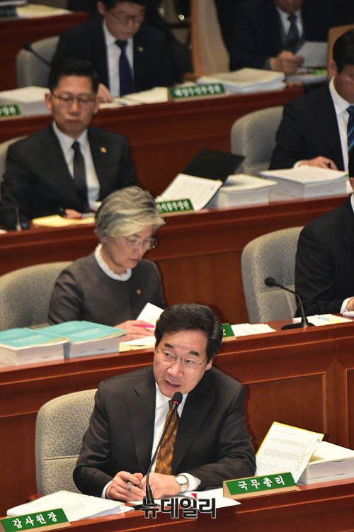 이낙연 국무총리가 6일 국회에서 열린 예산결산특별위원회 종합정책질의에서 의원들의 질문에 답하고 있다.