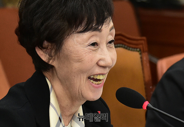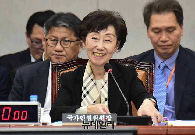최영애 국가인권위원장이 7일 오전 국회에서 열린 운영위원회의 국가인권위원회에 대한 국정감사에서 환하게 웃고 있다.
