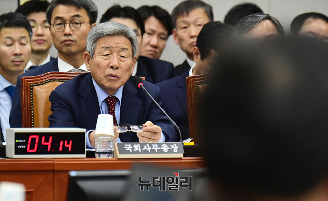 유인태 국회 사무총장이 7일 국회 운영위원회에서 열린 국회 사무처 국정감사에서 의원들의 질문에 답하고 있다.