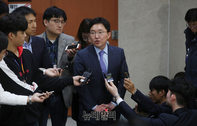 김용태 자유한국당 사무총장이 9일 오전 국회 정론관에서 기자회견을 열고 전원책 자유한국당 조직강화특별위원회 위원의 해촉 결정 발표한 후 기자들의 질문에 답하고 있다.