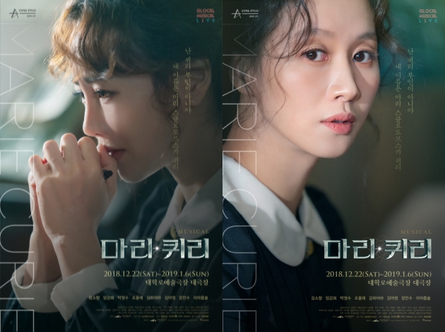 창작뮤지컬 '마리 퀴리'의 강렬한 메인 포스터와 캐릭터 포스터가 공개됐다메인 포스터에서 김소향과 임강희는 실제 실험에 사용되는 도구가 즐비한 책상을 배경으로 강인하면서도 복잡한 감정이 드러나는 눈빛으로 자신의 연구에 확신을 가졌지만 예상치 못한 유해성에 고뇌하는 '마리 퀴리'를 표현했다김소향의 포스터에는 "뭔가 더 있어. 멈출 수 없어. 알아낼거야. 좀 더 가보자"를, 임강희 포스터에는 "여기에 있어. 새로운 원소. 아무도 모르는 작고 작은 세계"라는 극중 '마리 퀴리'의 대사로 강인한 의지와 과학에 대한 열정을 그대로 드러냈다.전 배역의 각기 다른 이야기를 담은 캐릭터 포스터는 극중 중심 소재인 라듐의 청록색을 모티브로 작품의 묵직한 색채를 담아 디자인됐다.'마리 퀴리'의 연구 동반자인 '피에르 퀴리' 역의 박영수와 라듐사업으로 자수성가한 '루벤' 역을 맡은 조풍래는 굳은 의지의 눈빛으로 극중 라듐의 유해성으로 대척점에 서게 되는 캐릭터를 완성했다.이어 포스터에 삽입된 "나는 인류가 새로운 발견을 통해 악보다는 선을 끌어낼 것이라고 믿는다"라는 피에르의 대사와 "모든 성장의 역사에 희생이 없던 적은 없죠"라는 루벤의 대사는 서로의 목적을 관철시키고자 하는 두 사람의 관계성을 보여준다.