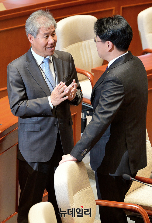 김수현 신임 청와대 정책실장과 장제원 자유한국당 의원이 12일 오전 국회에서 열린 예산결산특별위원회의 전체회의에 참석해 대화를 나누고 있다.