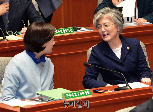 강경화 외교부 장관과 유은혜 부총리 겸 교육부장관이 12일 오전 국회에서 열린 예산결산특별위원회의 전체회의에 출석해 대화를 나누고 있다.