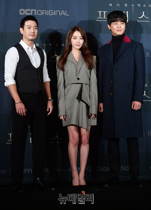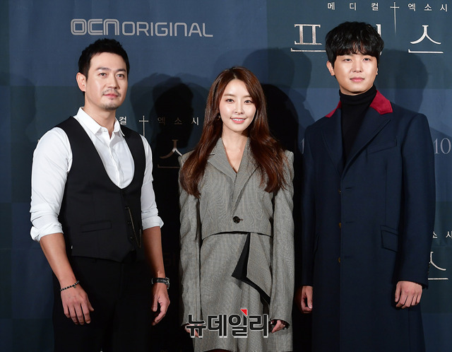 배우 박용우, 정유미, 연우진(왼쪽부터)이 12일 오후 서울 영등포구 콘래드 호텔에서 열린 OCN 메디컬 엑소시즘 드라마 '프리스트(연출 김종현, 극본 문만세)' 제작보고회에서 포토타임을 갖고 있다.