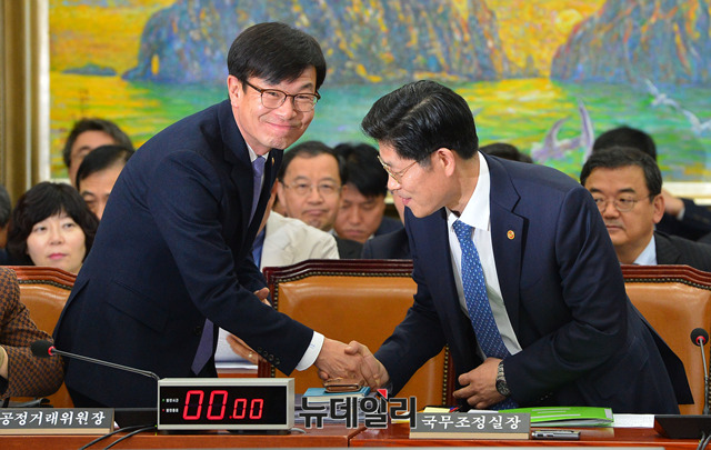 노형욱 국무조정실장과 김상조 공정거래위원장이 12일 오후 국회에서 열린 정무위 전체회의에서 악수를 나누고 있다.