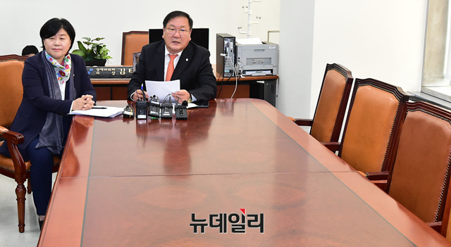 김태년 더불어민주당 정책위의장과 서영교 원내수석부대표가 '여-야-정 국정상설협의체 합의문 이행 추진을 위한 3당 실무 TF' 1차 회의가 예정된 12일 오후 국회에서 회의 파행 이유를 설명하고 있다.