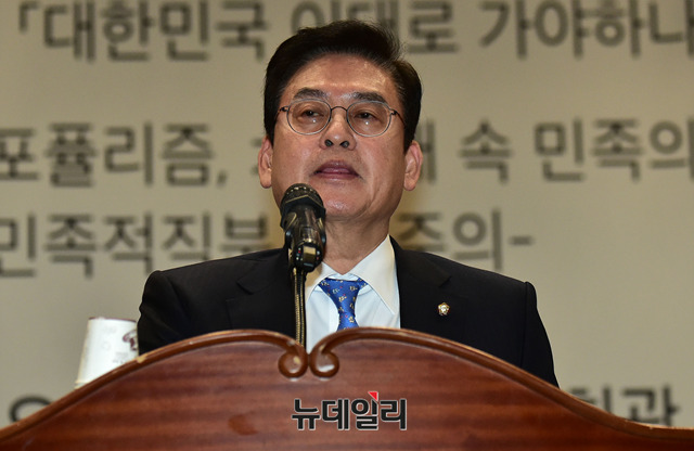 정우택 자유한국당 의원이 13일 오후 국회 의원회관에서 '대한민국 이대로 가야하나'를 주제로 열린 시국강연회를 갖고 있다.