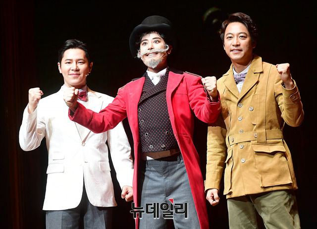 배우 이규형, 한지상, 오만석이 13일 오후 서울 종로구 홍익대 대학로 아트센터 대극장에서 열린 뮤지컬 '젠틀맨스 가이드 : 사랑과 살인편' 프레스콜에서 하이라이트 장면을 시연하고 있다.