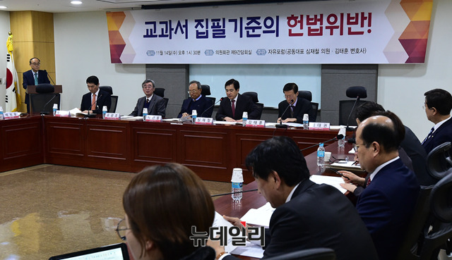 자유민주주의와 시장경제 포럼(대표 심재철)가 14일 오후 국회 의원회관에서 '교과서 집필기준의 헌법위반!'이라는 주제로 세미나를 하고 있다.