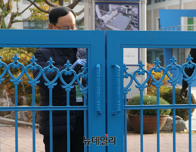 여의도여자고등학교 관계자가 2019학년도 대학수학능력시험일인 15일 오전 서울 영등포구 여의도여고에서 시험이 시작되자 시험장 문을 닫고 있다. 올해 수능은 지난해 보다 1,397명이 증가한 59만4,924명이 응시해 전국 86개 시험지구 1,190개 시험장에서 치러진다.