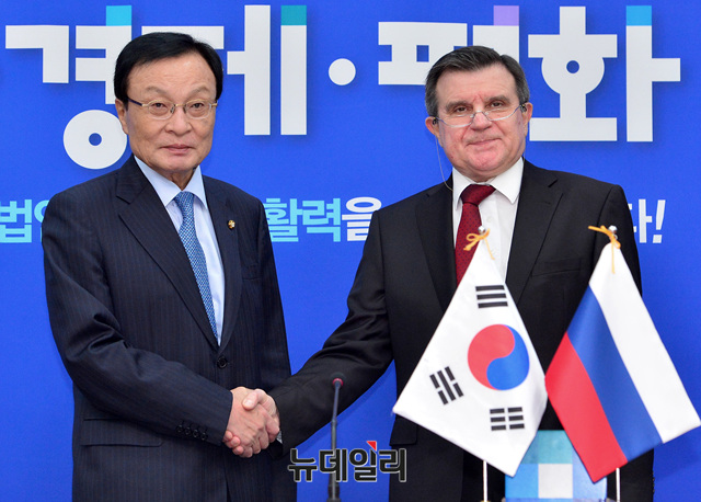 안드레이 쿨릭(Andrey Kulik) 주한러시아대사가 15일 오전 국회에서 이해찬 더불어민주당 대표를 예방해 악수를 나누고 있다.