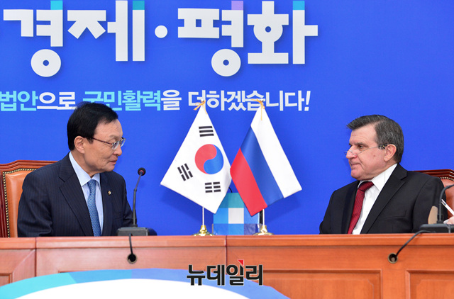 안드레이 쿨릭(Andrey Kulik) 주한러시아대사가 15일 오전 국회에서 이해찬 더불어민주당 대표를 예방해 대화를 나누고 있다.