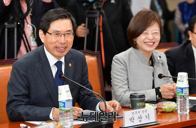 박상기 법무부 장관과 진선미 여성가족부 장관이 16일 오후 국회 더불어민주당 원내대표회의실에서 열린 '디지털 성범죄 근절 입법 방안을 논의하기 위한 당정협의'에서 대화를 나누고 있다.
