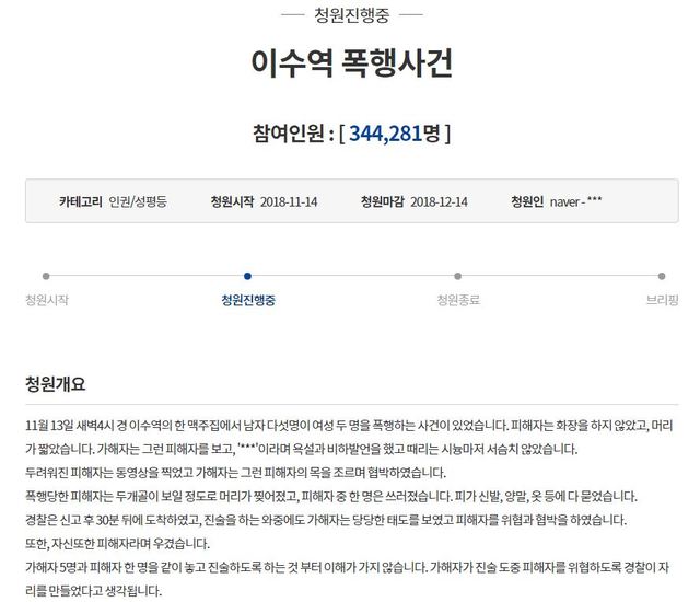여성 혐오 폭행 사건으로 알려져 사회적 공분을 불러일으켰던 이른바 '이수역 폭행사건' 관련 청와대 국민 청원이 16일 오전 11시 기준 34만 명을 돌파했다. 청와대의 답변 기준인 20만 명을 이틀 만에 훌쩍 넘겼다.평소 여성 인권을 강조해온 문재인 대통령의 입장을 감안하면 여성 관련 범죄에 단호한 대처를 강조하는 답변이 예상되지만, 사건의 전말이 재조명되면서 여론의 방향이 정반대로 불고 있어 청와대의 고민도 깊어지는 모양새다. 나아가 정치권에서는 소위 '떼법'에 대한 경각심을 가져야 한다는 비판도 함께 나온다.靑 청원답변 기준 충족한 '이수역 폭행사건'청와대가 '이수역 폭행사건'에 대해 답변을 할 것으로 보인다. 국민청원 게시판에 올라온〈이수역 폭행사건〉청원이 34만명을 기록하면서, 청와대의 답변 기준을 일찌감치 충족했기 때문이다.지난 14일 〈이수역 폭행사건〉 청원에서 청원인은 "화장을 하지 않고, 머리가 짧다는 이유만으로 피해자 두 명이 남자 5명에게 폭행을 당했다"며 "가해자의 신원을 밝혀주시고, 무자비하게 피해자를 폭행한 가해자에게 죄에 맞는 처벌을 부탁드린다"고 했다.이 청원인은 "폭행당한 피해자는 두개골이 보일 정도로 머리가 찢어졌고, 피해자 중 한 명은 쓰러졌다"며 "경찰은 신고 후 30분 뒤에 도착하였고, 진술을 하는 와중에도 가해자는 당당한 태도를 보였고 피해자를 위협과 협박을 했다. 자신 또한 피해자라며 우겼다"고 했다.이어 경찰의 태도도 문제 삼았다. 청원인은 "가해자 5명과 피해자 한 명을 같이 놓고 진술하도록 하는 것부터 이해가 가지 않는다"며 "가해자가 진술 도중 피해자를 위협하도록 경찰이 자리를 만들었다고 생각된다"고 적었다.이같은 청원은 자신을 피해자로 지칭한 여성이 지난 13일 새벽 4시경 이수역의 한 맥줏집에서 겪은 사건과 관련, 쇼셜미디어에 게재한 글을 기반으로 하고 있다. 해당 글은 여초카페(여성 사용자의 비율이 높은 인터넷 카페)자 및 커뮤니티 등 인터넷상에서 퍼져 공분을 샀고, 순식간에 확산됐다.