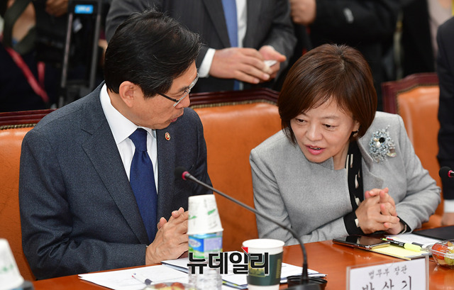 박상기 법무부 장관과 진선미 여성가족부 장관이 16일 오후 국회 더불어민주당 원내대표 회의실에서 열린 '디지털 성범죄 근절 입법 방안을 논의하기 위한 당정협의'에서 대화를 나누고 있다.