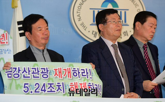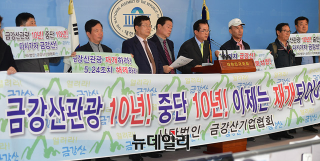금강산기업협회 회원들과 설훈 더불어민주당 의원이 16일 국회 정론관에서 금강산관광 재개를 촉구하는 기자회견을 갖고 있다.