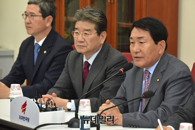 안상수 자유한국당 예결위원장이 19일 국회에서 열린 상임위원장 간사단 긴급 연석회의에서 모두발언을 하고 있다.