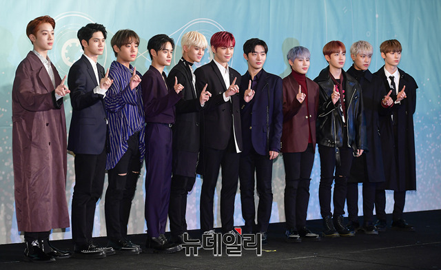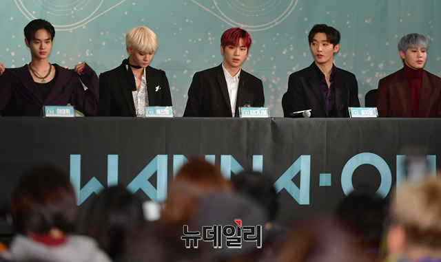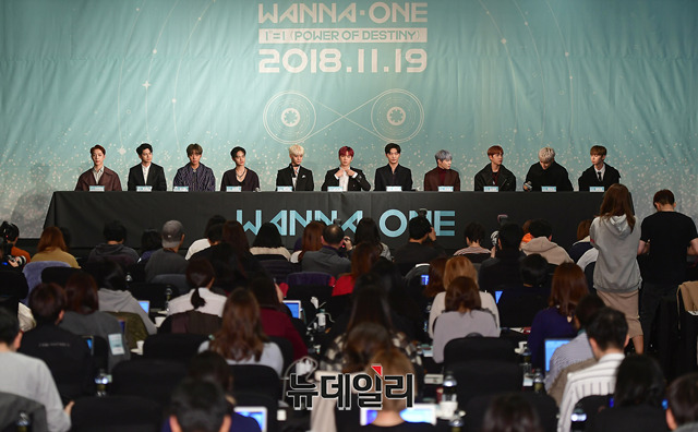 아이돌그룹 워너원(WANNA·ONE)이 19일 오후 서울 여의도 콘래드호텔에서 첫 번째 정규앨범 '1¹¹=1(POWER OF DESTINY)' 발매 기념 기자간담회에서 포토타임을 갖고 있다.첫 번째 정규앨범 '1¹¹=1(POWER OF DESTINY)'은 그 동안 연산 시리즈를 선보였던 원너원이 하나로써 함께 하는 의지를 '1¹¹=1'라는 수식으로 형상화했다.타이틀곡 '봄바람'은 데뷔곡 에너제틱의 작곡가 Flow Blow와 iHwak이 프로듀싱을 맡아 완성시킨 얼터너티브 댄스 장르 곡이다. 음원은 19일 오후 6시에 공개됐다.