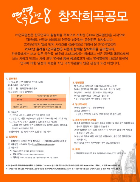 공모는 접수된 작품들 중 2작품을 예선당선작으로 선정해 2019년 1월 낭독회를 거쳐 최종 당선작을 발표할 예정이다. 당선작은 예선 당선작에 상금 500만원이 수여되며, 최종 당선작에는 상금 1000만원과 '연극열전8' 본 공연 상연의 기회가 주어진다.