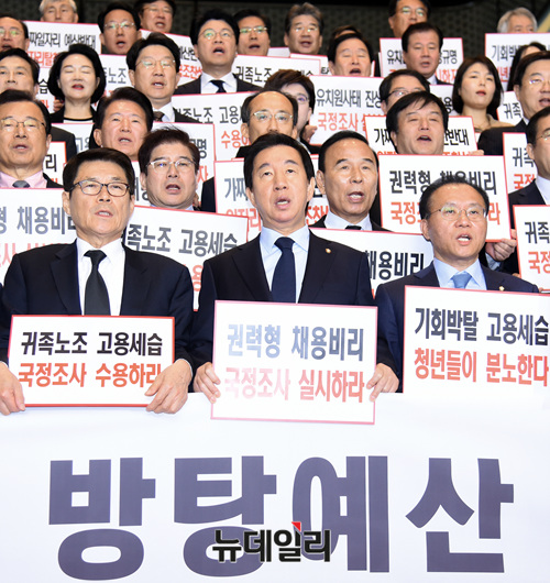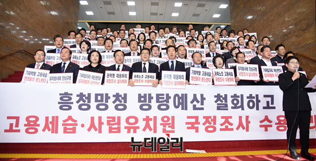 김성태 자유한국당 원내대표 등 소속 의원들이 20일 오전 국회에서 열린 의원총회 후 피켓을 들고, 고용세습 및 사립유치원 비리 국정조사를 촉구하고 있다.