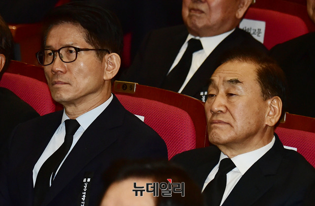 김문수 전 경기도지사와 이재오 자유한국당 상임고문이 20일 국회 의원회관에서 열린 故 김영삼 전 대통령의 추도식에 참석해 행사를 지켜보고 있다.