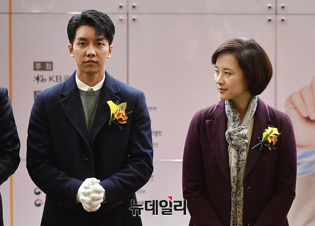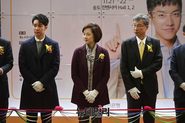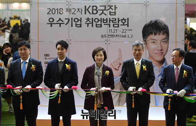가수 이승기가 21일 오전 인천 송도 컨벤시아에서 열린 '2018 제2차 KB굿잡 우수기업 취업박람회'에서 유은혜 교육부 장관, 허인 KB국민은행장과 함께 자리하고 있다.