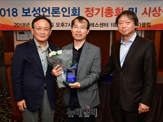 배영대(보성고 73회) 중앙일보 문화선임기자가 21일 오후 서울 중구 한국프레스센터에서 열린 보성언론인회 정기총회 및 시상식에서 수상 직후 기념촬영을 하고 있다.