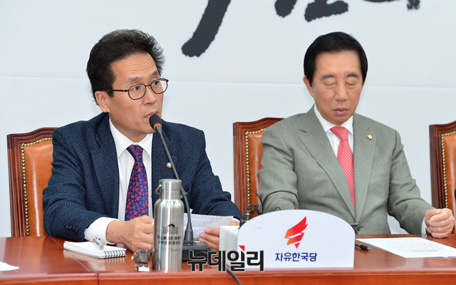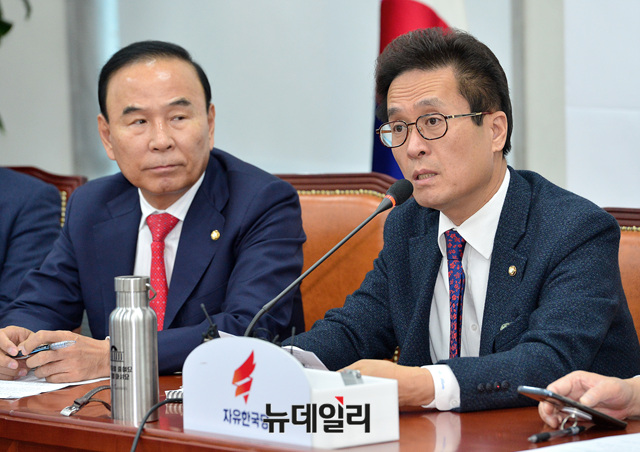함진규 자유한국당 정책위의장이 22일 오전 국회에서 열린 비상대책위원회의에 참석해 모두발언 하고 있다.