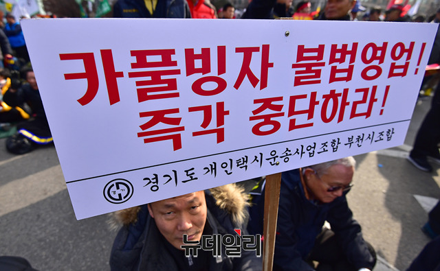 카카오의 카풀 서비스 도입에 반대하는 전국택시노조와 전국개인택시운송사업조합 등 4개 택시단체들이 22일 오후 서울 여의도 국회의사당 앞에서 제2차 택시 생존권 사수 결의대회에 참석해 자리하고 있다. 이들은 "카카오 카풀 서비스가 택시기사들의 생존권을 위협하는 불법 자가용 영업"이라고 주장했다.