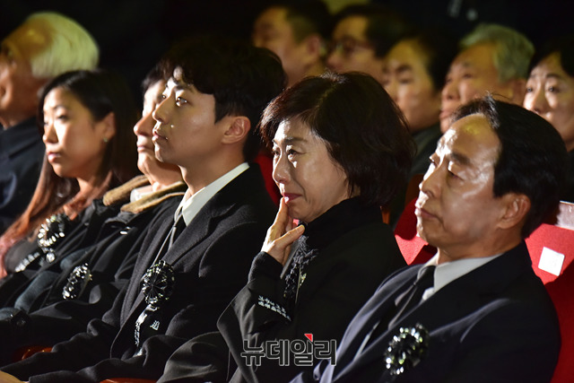 고 김영삼 전 대통령 차남인 김현철 국민대 특임교수 부인 김정현 씨가 22일 오후 서울 동작구 국립서울현충원 현충관에서 열린 김영삼 전 대통령 서거 3주기 추모식에서 눈물을 흘리고 있다.