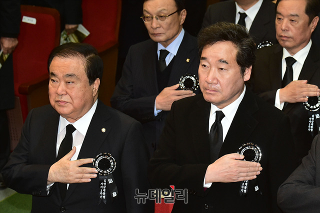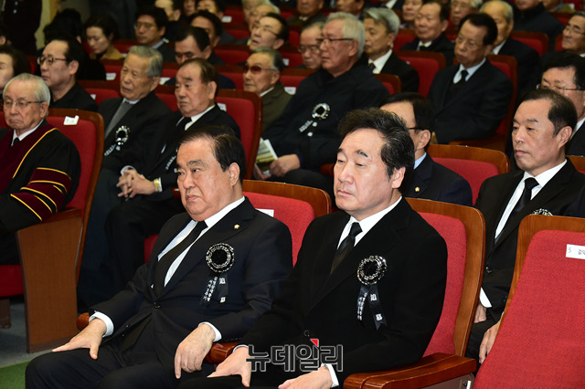 문희상 국회의장과 이낙연 국무총리가 22일 오후 서울 동작구 국립서울현충원 현충관에서 열린 김영삼 전 대통령 서거 3주기 추모식에 참석해 행사를 지켜보고 있다.