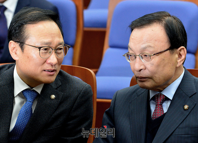 이해찬 더불어민주당 대표와 홍영표 원내대표가 23일 오전 국회에서 열린 의원총회에 참석해 대화를 나누고 있다.