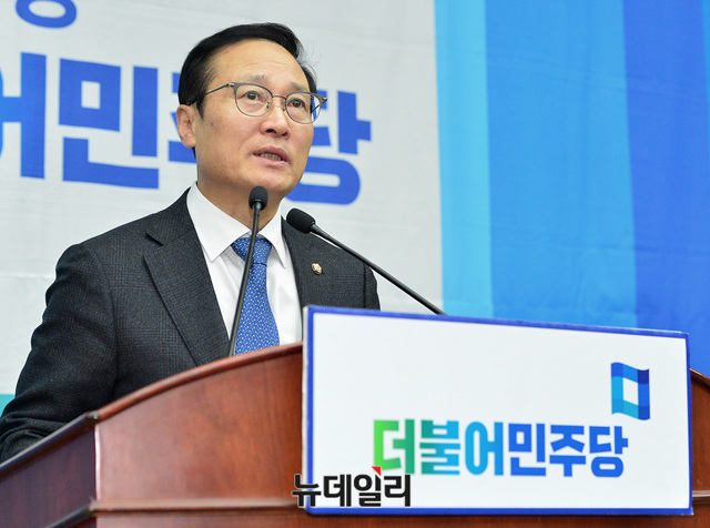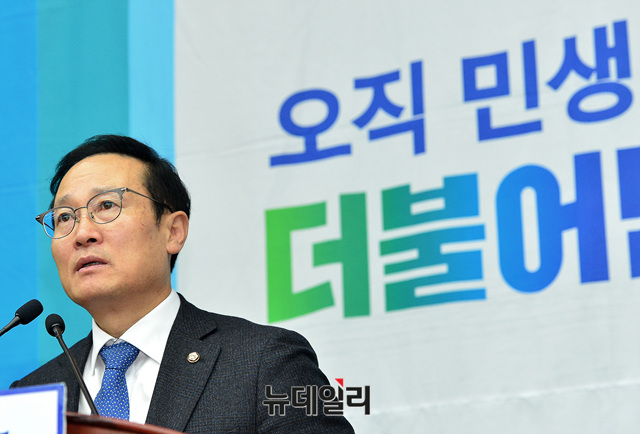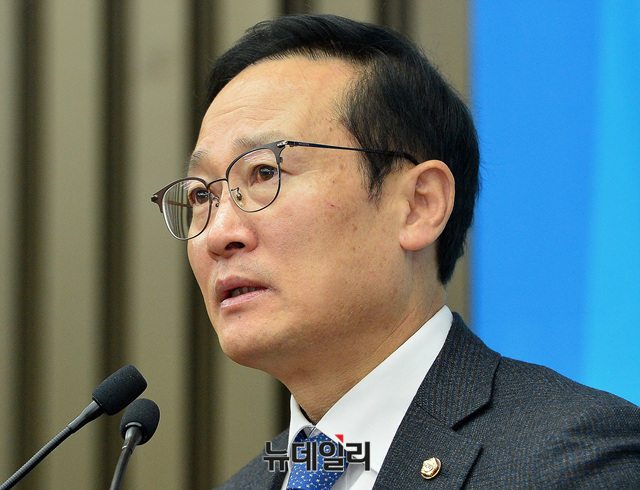 홍영표 더불어민주당 원내대표가 23일 오전 국회에서 열린 의원총회에 참석해 모두발언 하고 있다.