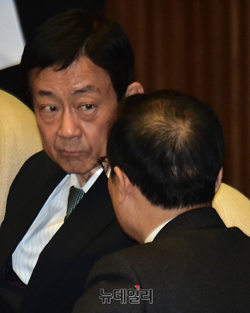 홍영표 더불어민주당 원내대표와 진영 의원이 23일 오전 국회에서 열린 국회 본회의에 참석해 대화를 나누고 있다.