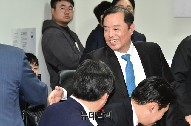김병준 자유한국당 비상대책 위원장이 23일 오후 국회 의원회관에서 열린 '문재인 정권, 지상파 중간광고 왜 허용하려 하는가?' 정책토론회에서 참석자들과 인사를 나누고 있다.
