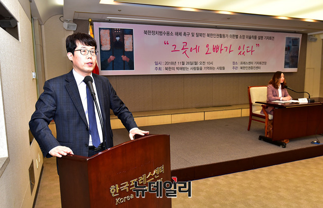 정베드로 북한정의연대 대표가 26일 오전 서울 중구 한국프레스센터에서 열린 기자회견에서 이한별 북한인권증진센터 소장을 소개하고 있다. 이 소장은 '북한의 박해받는 사람들을 기억하는 주간, 자카를 코리아(Zakar Kore)'중 3주간 열리는 미술전시회에 초청돼 북한인권을 다룬 작품을 전시한다. 이번 전시는 지난 24일부터 서울 서초구 호민아트갤러리에서 3주간 전시 된다.