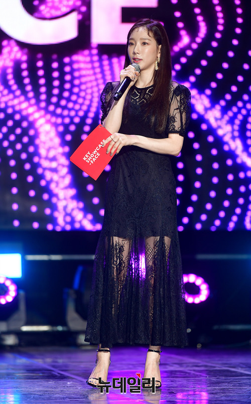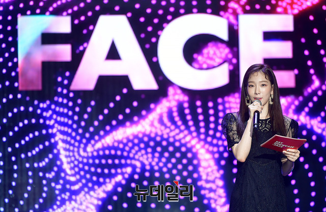 가수 태연이 26일 오후 서울 광진구 건국대학교 새천년관 대공연장에서 열린 샤이니 키의 첫 솔로앨범 ‘FACE’ 발매 기념 쇼케이스에서 키를 소개하고 있다.