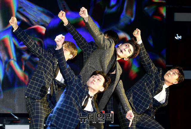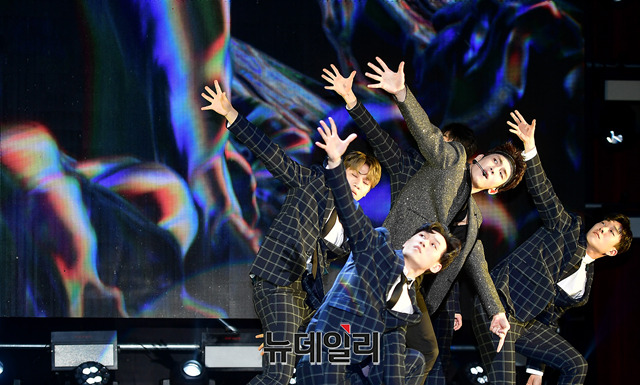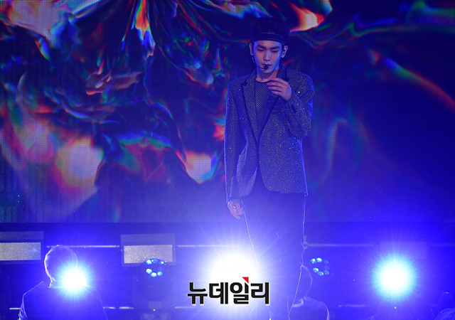 샤이니 키가 26일 오후 서울 광진구 건국대학교 새천년관 대공연장에서 열린 첫 솔로앨범 ‘FACE’ 발매 기념 쇼케이스에서 수록곡 무대를 선보이고 있다.