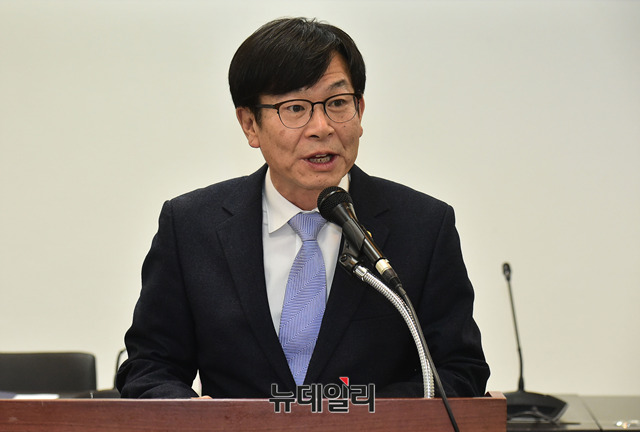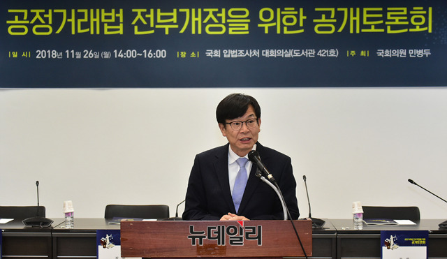 김상조 공정거래위원장이 26일 오후 국회 도서관에서 열린 공정거래법 전부개정을 위한 토론회에 참석해 인사말을 하고 있다.
