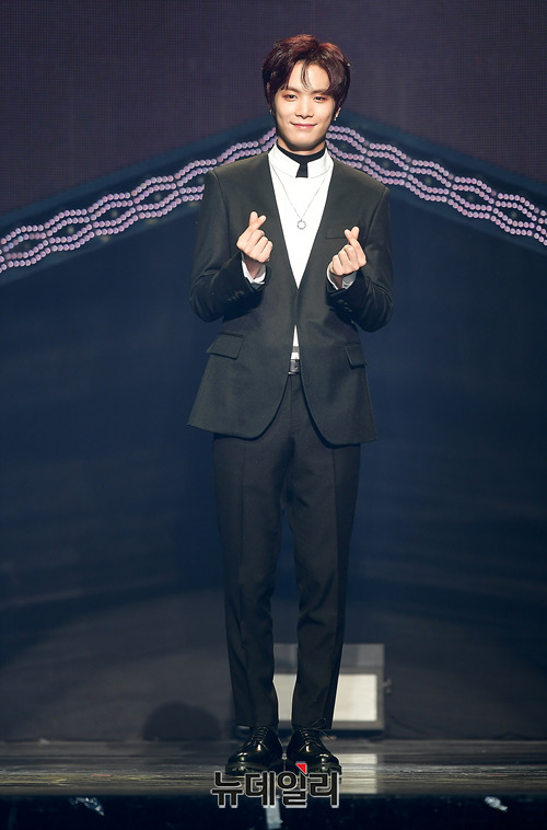 그룹 뉴이스트W 리더 JR이 26일 오후 서울 용산구 블루스퀘어에서 열린 신규앨범 'WAKE,N(웨이크엔)' 쇼케이스에서 포토타임을 갖고 있다.