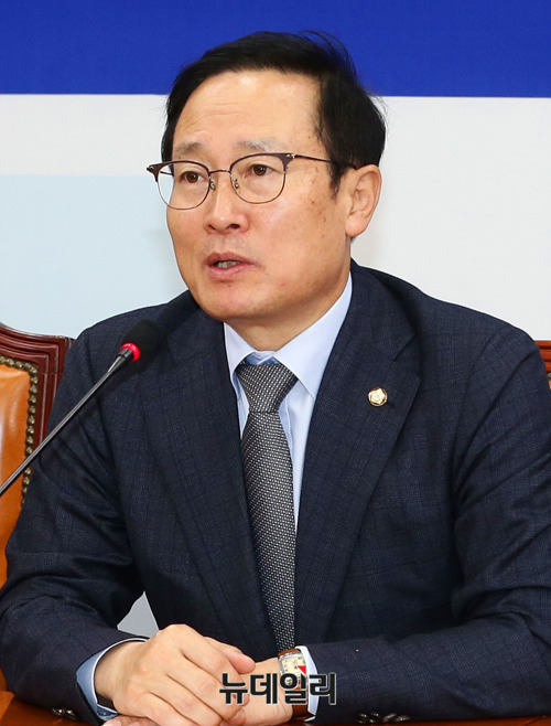홍영표 더불어민주당 원내대표이 27일 오전 국회에서 열린 원내대책회의에 참석해 모두발언을 하고 있다.