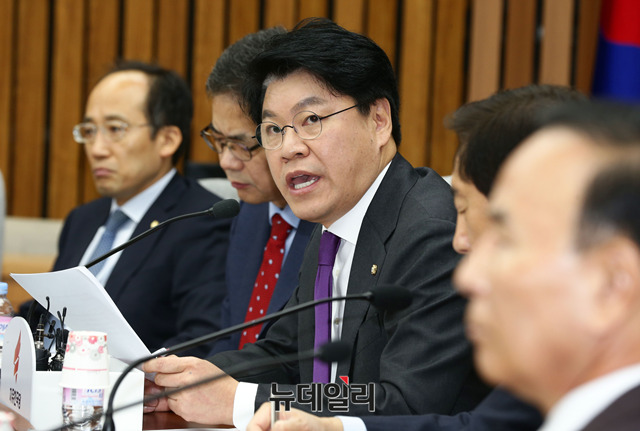 장제원 자유한국당 예산결산특별위원회 간사 27일 오전 국회에서 열린 원내대책회의에서 모두발언을 하고 있다.